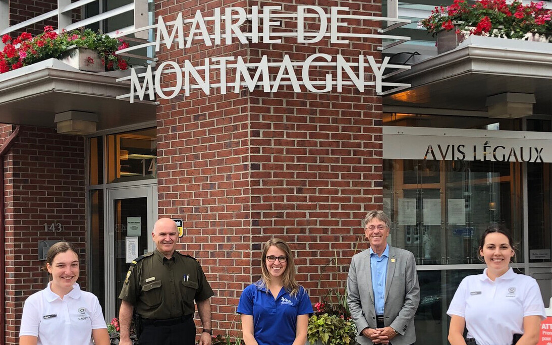 Sur la photographie, on aperçoit la cadette Juliette Gagnon, le sergent Daniel Fortin, l'inspectrice étudiante à la Ville de Montmagny Léa Bompard, le maire de Montmagny Rémy Langevin et la cadette Julie-Pier Bastille.