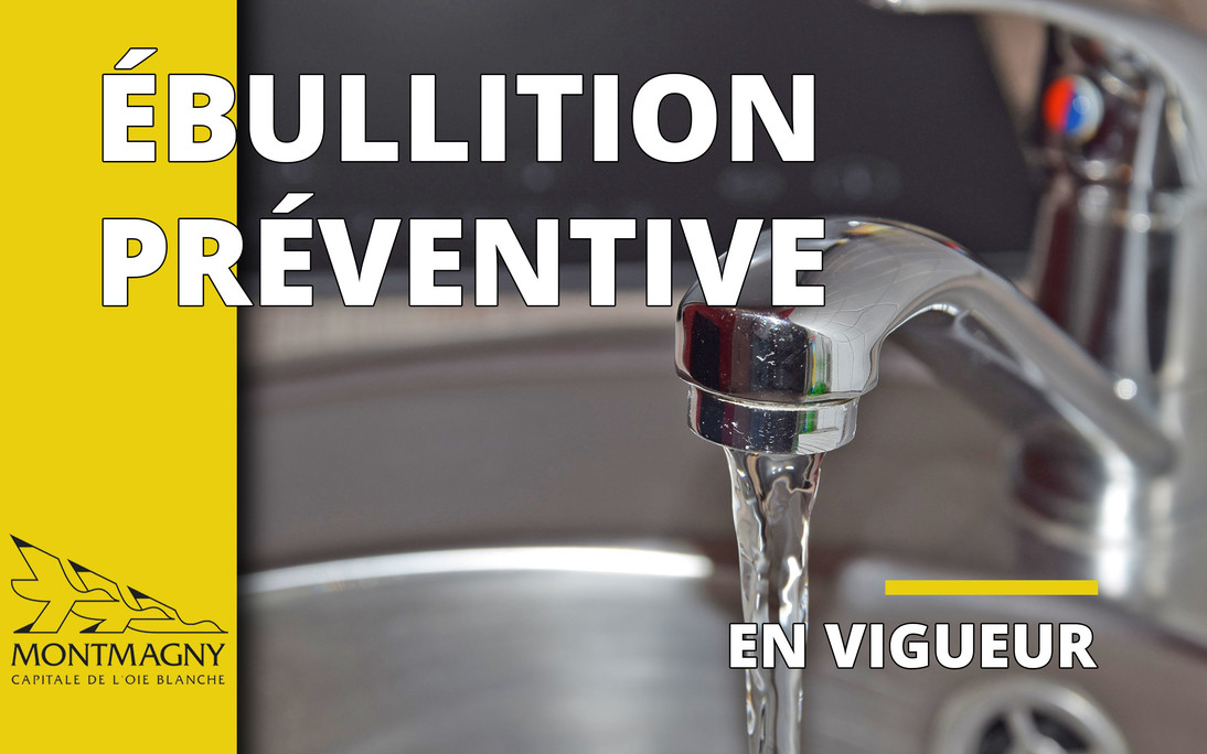 La Ville de Montmagny désire informer les citoyens domiciliés sur la rue des Ormes (numéros civiques de 1 à 24 inclusivement) et au 130, rue Robin qu'un avis préventif est en vigueur en raison des travaux en cours dans le secteur de la Place des Ormes. Jusqu'à nouvel ordre, il est donc important de faire bouillir l'eau au moins une minute à gros bouillons avant de la consommer.