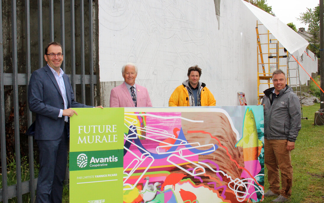 Sur la photo, on aperçoit MM. Michel Delisle, chef de la direction d'Avantis Coopérative, Bernard Boulet, maire de Montmagny, Yannick Picard, artiste-muraliste, et Jean-François Roy, coordonnateur des Fêtes du 375e.
