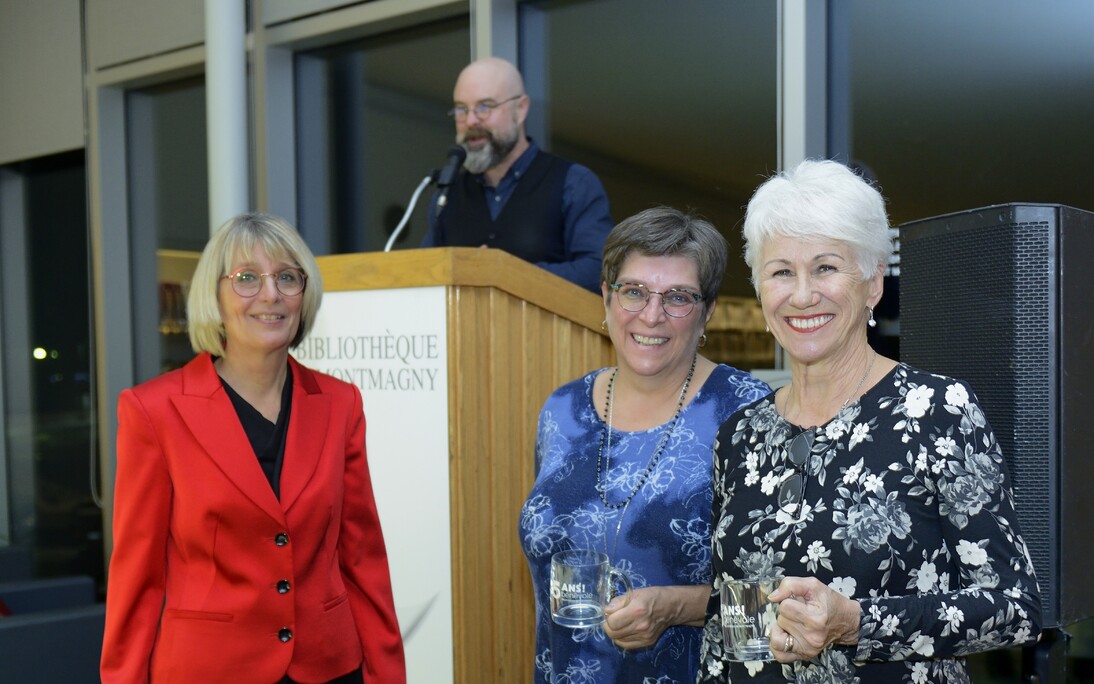 Sur la photo de Jean Beaulieu, on aperçoit Mmes Sylvie Couillard et Céline Ménard qui sont en compagnie de la présidente de la Corporation, Mme Sonia Godbout, et du directeur de la bibliothèque, M. Jocelyn Landry.