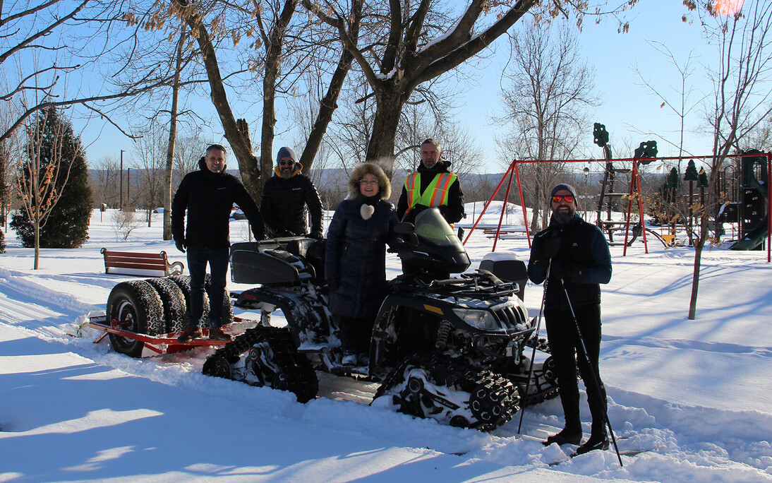 Sur la photo, on aperçoit la conseillère municipale du district, Mme Michelle Bernard, entourée des Enfants d'coeur, MM. Frédéric Ouellet et Dave Lamontagne (qui a adapté le traceur), de M. Christian Leblond qui trace bénévolement le parcours, et de M. Patrick Morency du Service des loisirs, de la culture et de la vie communautaire de Montmagny.