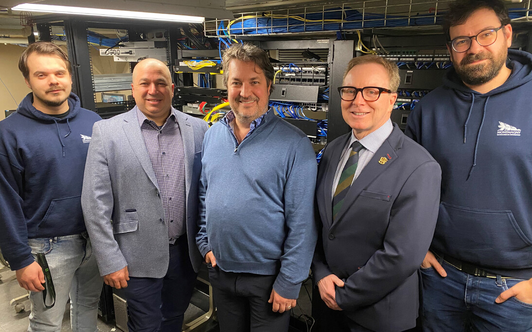 Sur la photo, on aperçoit le technicien en informatique, M. François-Xavier Noël, le préfet de la MRC de Montmagny, M. Frédéric Jean, le député de Côte-du-Sud, M. Mathieu Rivest, le maire de Montmagny, M. Marc Laurin, et le coordonnateur en technologie de l'information, M. Olivier Côté.
