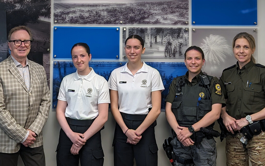 Les cadettes entourées de la superviseure aux permis et aux inspections à la Ville, Emmanuelle Forand, du maire, Marc Laurin, de coordonnatrice des cadettes à la SQ, Marise Rossignol, et de la sergente Pascale Richard.