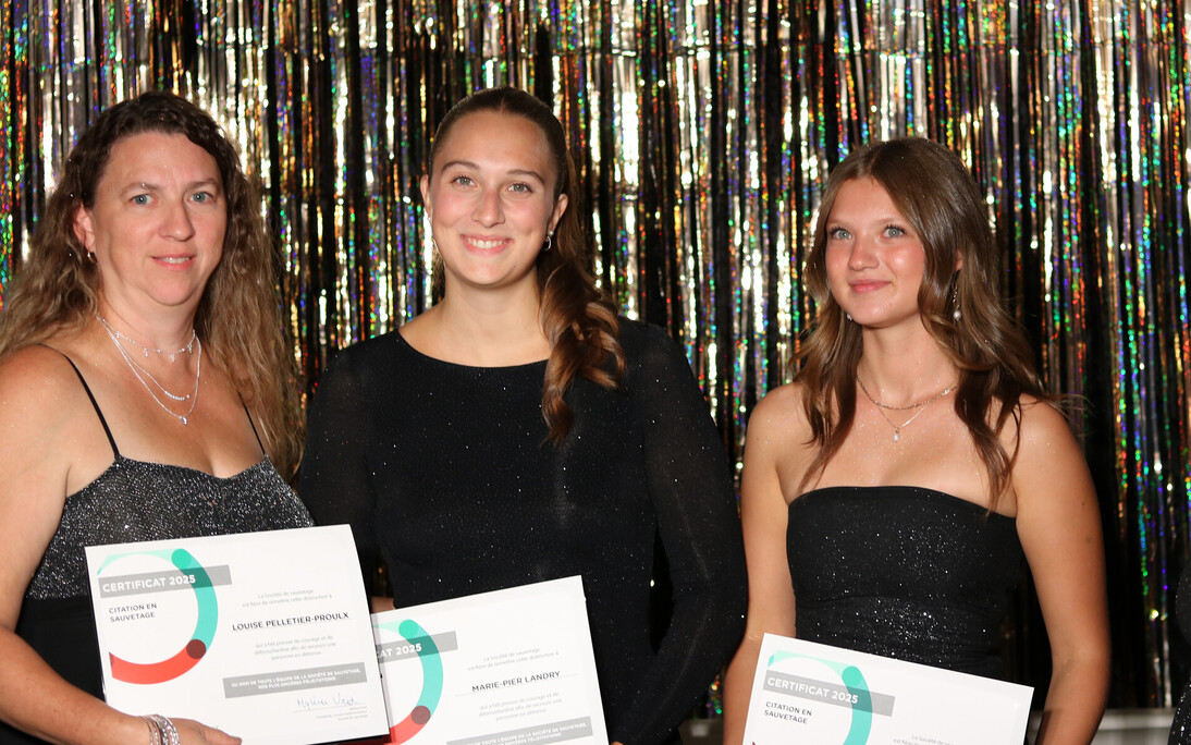 Le courage dont ont fait preuve trois sauveteuses de Montmagny, le 23 octobre 2024 à la piscine Guylaine-Cloutier, a été salué par la Société de sauvetage du Québec (SSQ). Lors de son forum annuel tenu à Montréal le 6 septembre dernier, l'organisme a remis une distinction honorifique à Louise Pelletier-Proulx, Marie-Pier Landry et Victoria Deschênes pour leur intervention auprès de Nicolas Gaudreau.