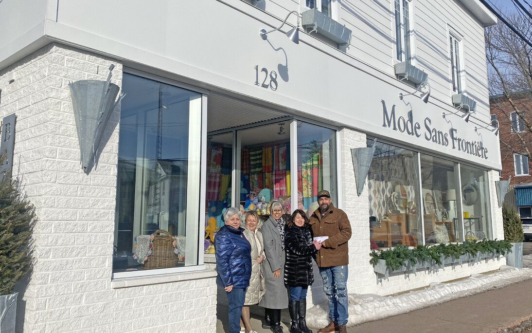 Sur la photo, on aperçoit la démarcheuse de la SDÉ, Anie Beaudet, entourée des représentant(e)s de Mode Sans Frontière Line Pellerin (administratrice), Michelle Bernard (administratrice), Lucie Gauthier (directrice générale) et Gino Dufour (président).