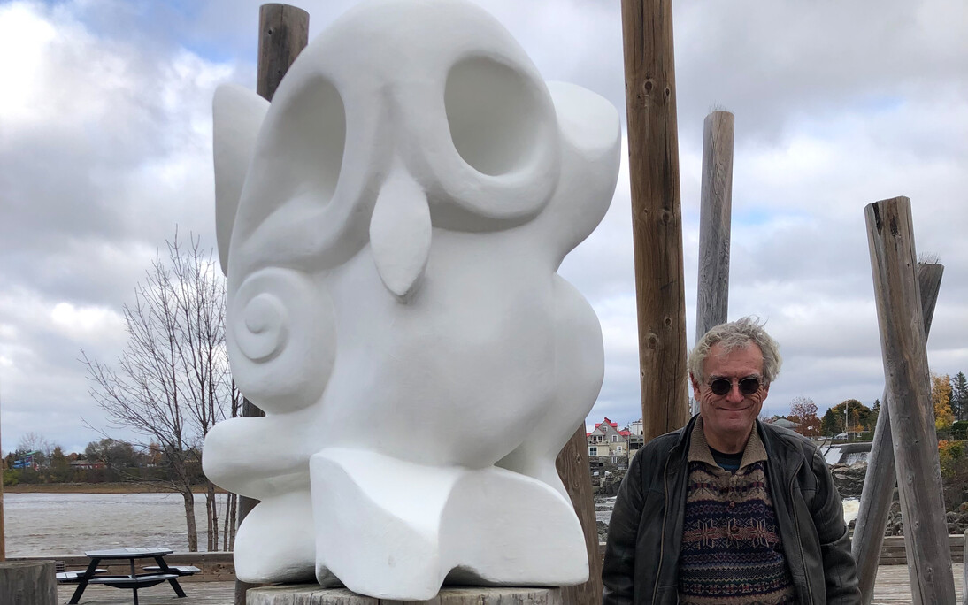 Réalisée en 1992 par l'artiste magnymontois Alain Gilbert, l'oeuvre « Hibou magique | Hommage à Riopelle » a repris sa place au Jardin des souches à Montmagny. La sculpture en bois et en fibre de verre a été restaurée par l'artiste-restaurateur Martin Beausoleil, que l'on aperçoit sur la photo aux côtés de l'oeuvre, grâce à un nouveau procédé qui permettra à l'oeuvre de demeurer intact pendant de nombreuses années.